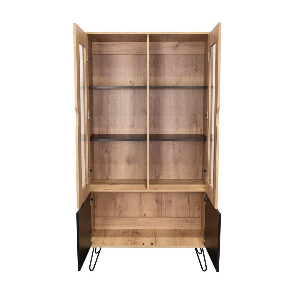 Alacena, con variedad de entrepaños, patas metálicas, y 4 puertas batientes.