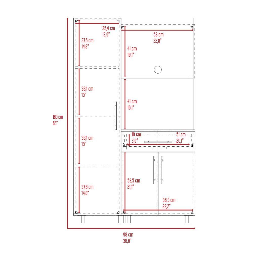 Alacena, con amplios espacios para almacenamiento, patas y manijas metálicas, espacio para microondas puertas abatibles y un cajón.