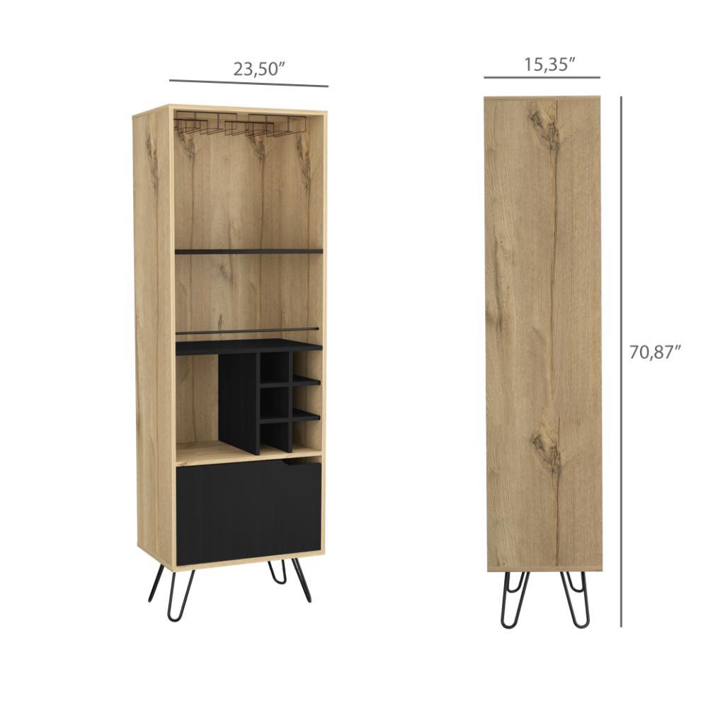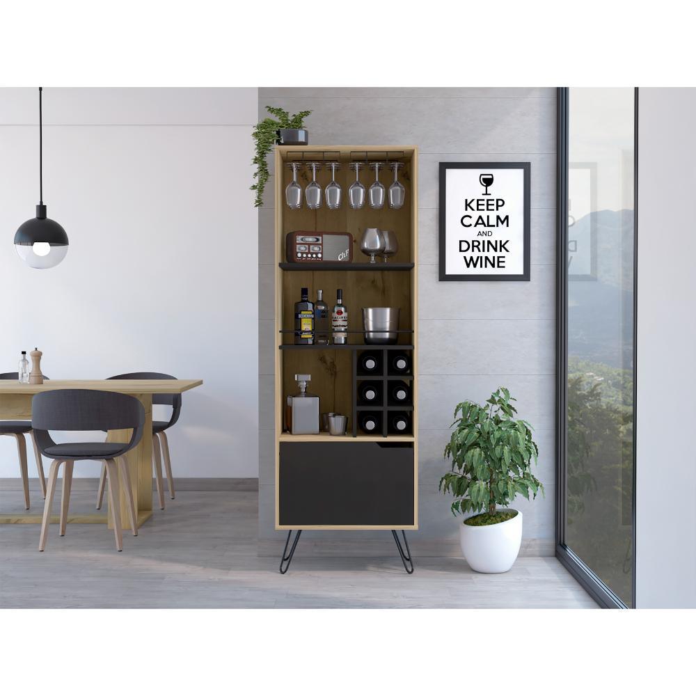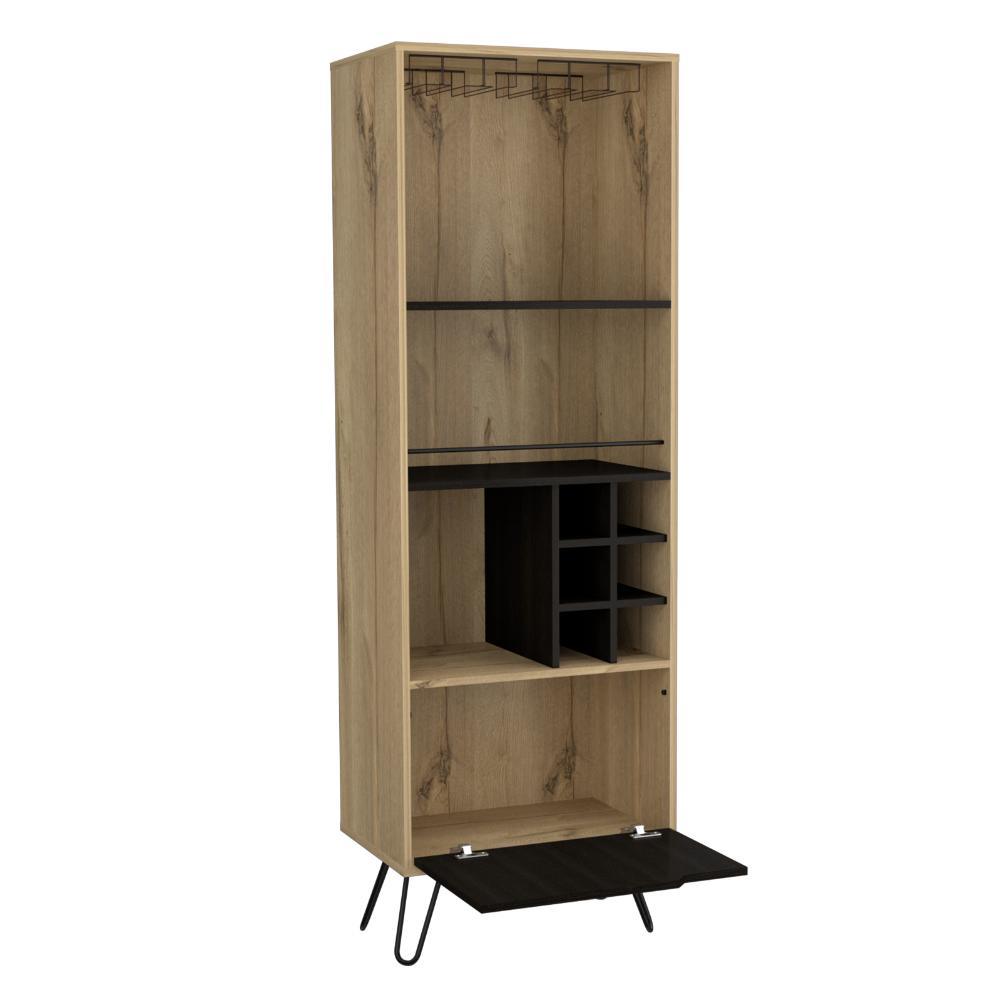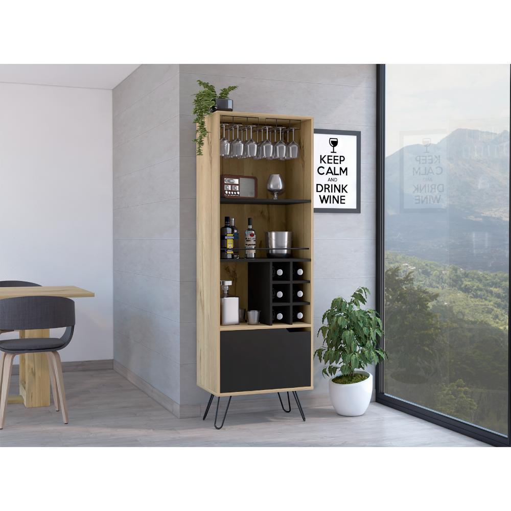 Bar Alto, con espacio superior para almacenar copas de vino, espacio para colocar objetos decorativos, espacio para organizar licores, patas metálicas en acero negro