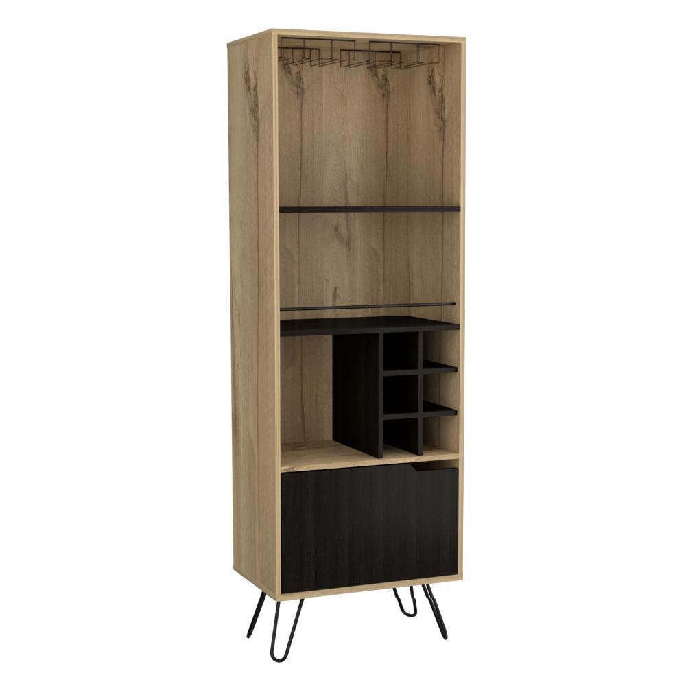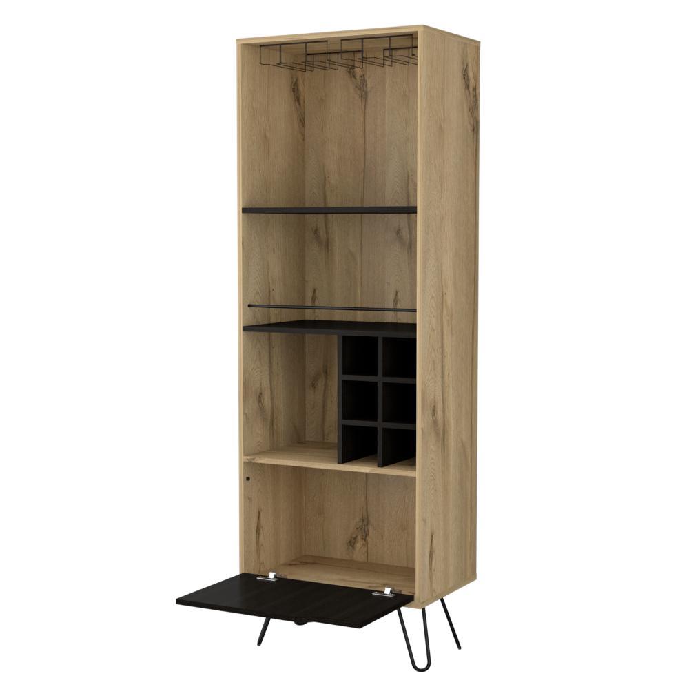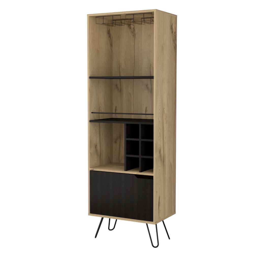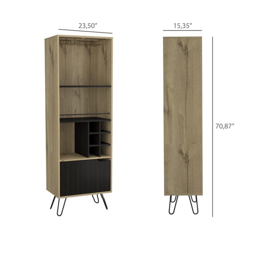 Bar Alto, con espacio superior para almacenar copas de vino, espacio para colocar objetos decorativos, espacio para organizar licores, patas metálicas en acero negro
