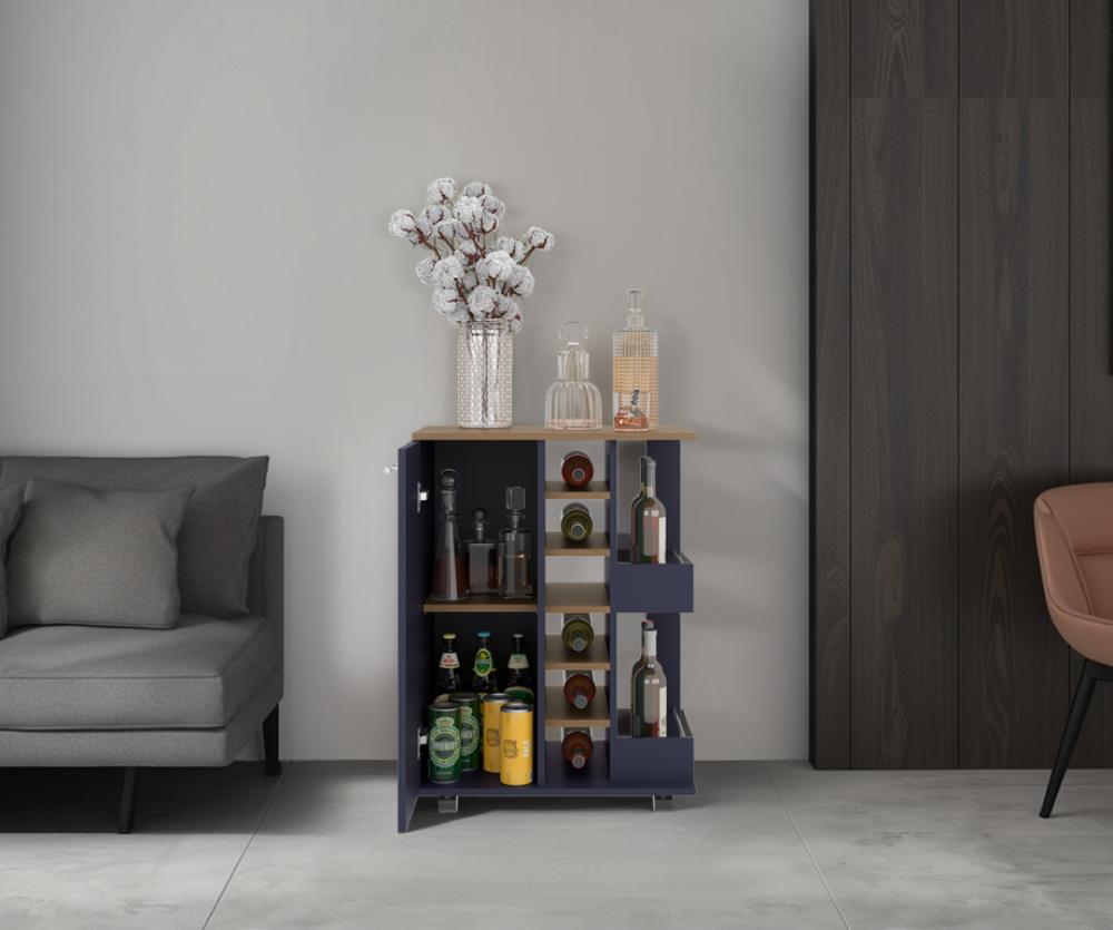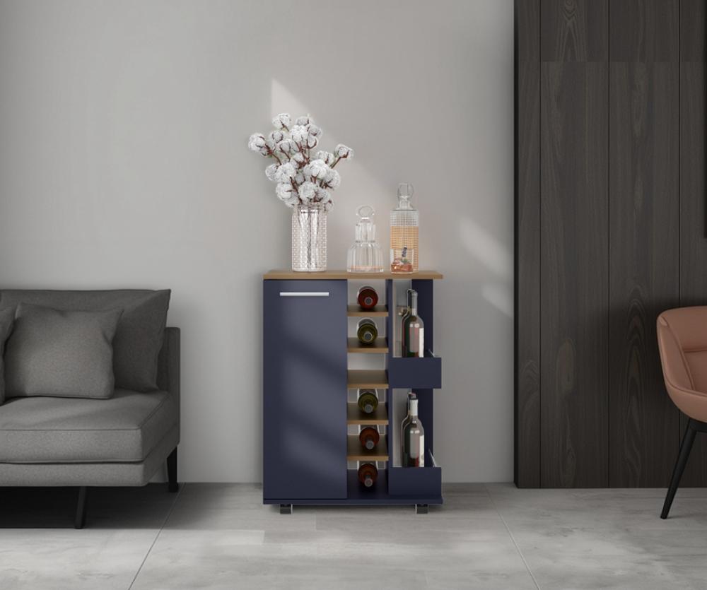 Bar, con espacio para ubicar botellas de vino, 1 puerta con manija, 1 entrepaño móvil y rodachinas.