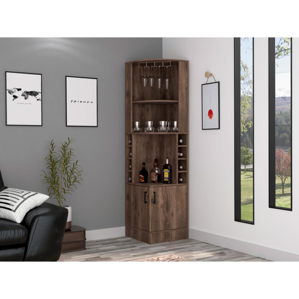 Bar Esquinero, con espacio superior para almacenar copas de vino, espacio para objetos decorativos, espacio para organizar licores, dos puertas batientes