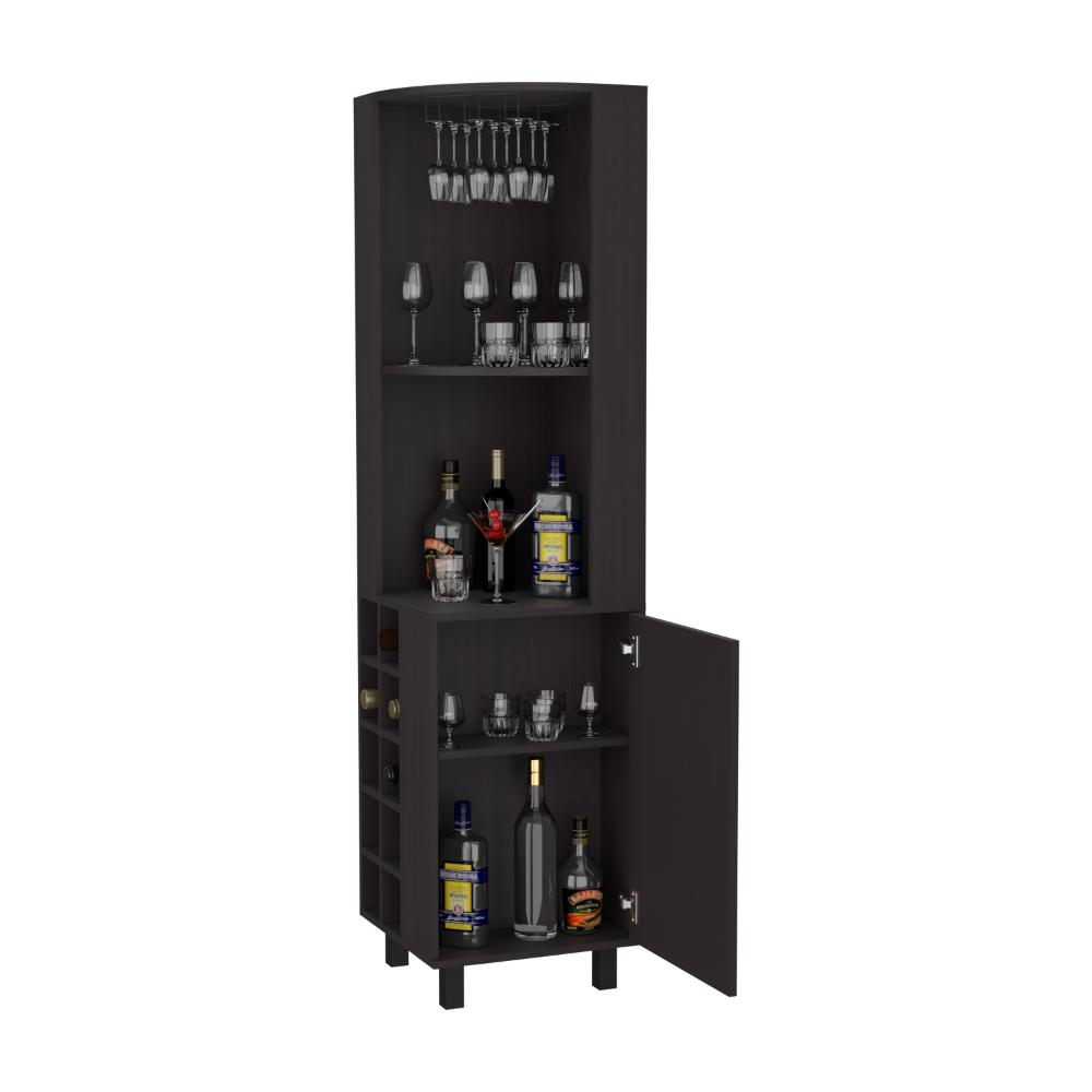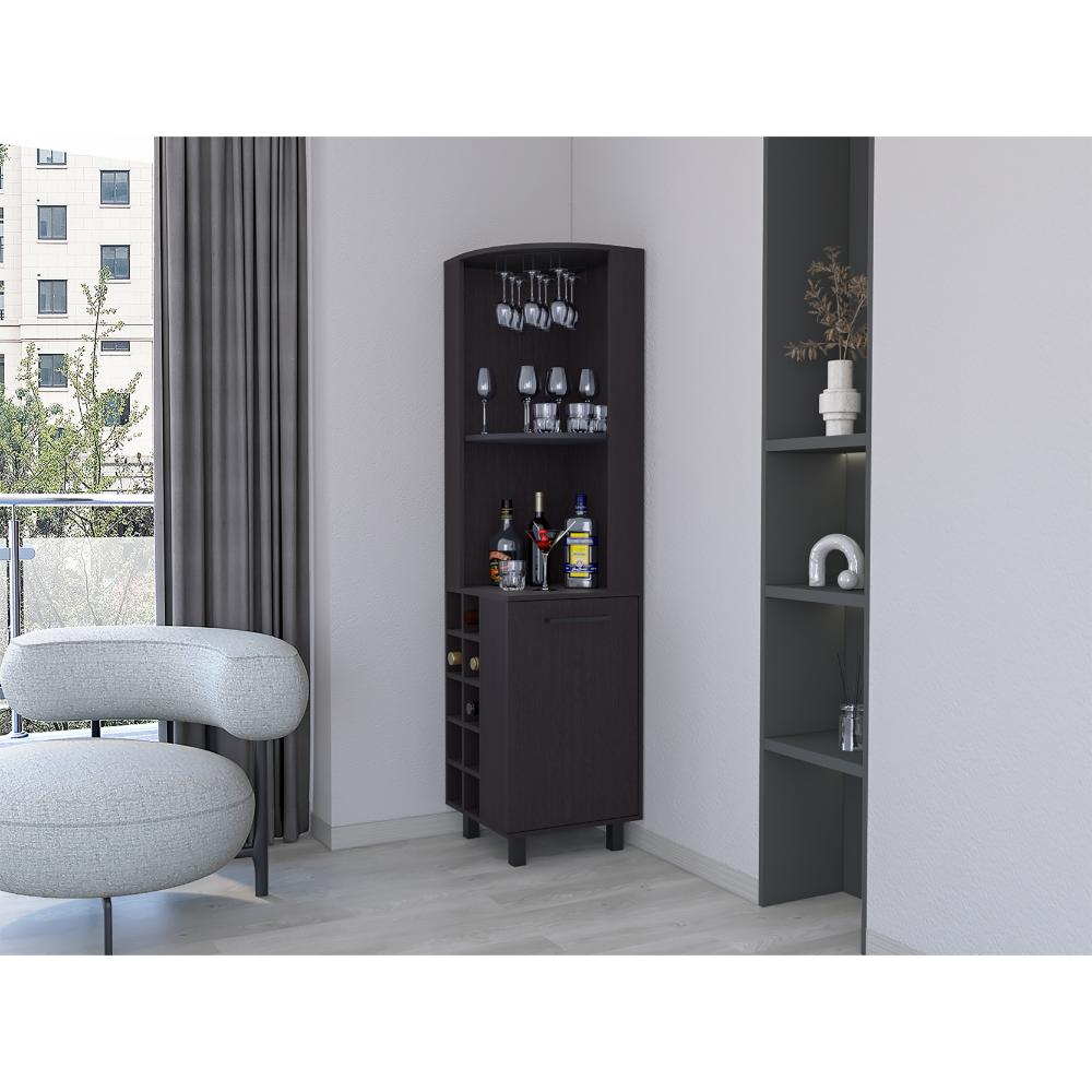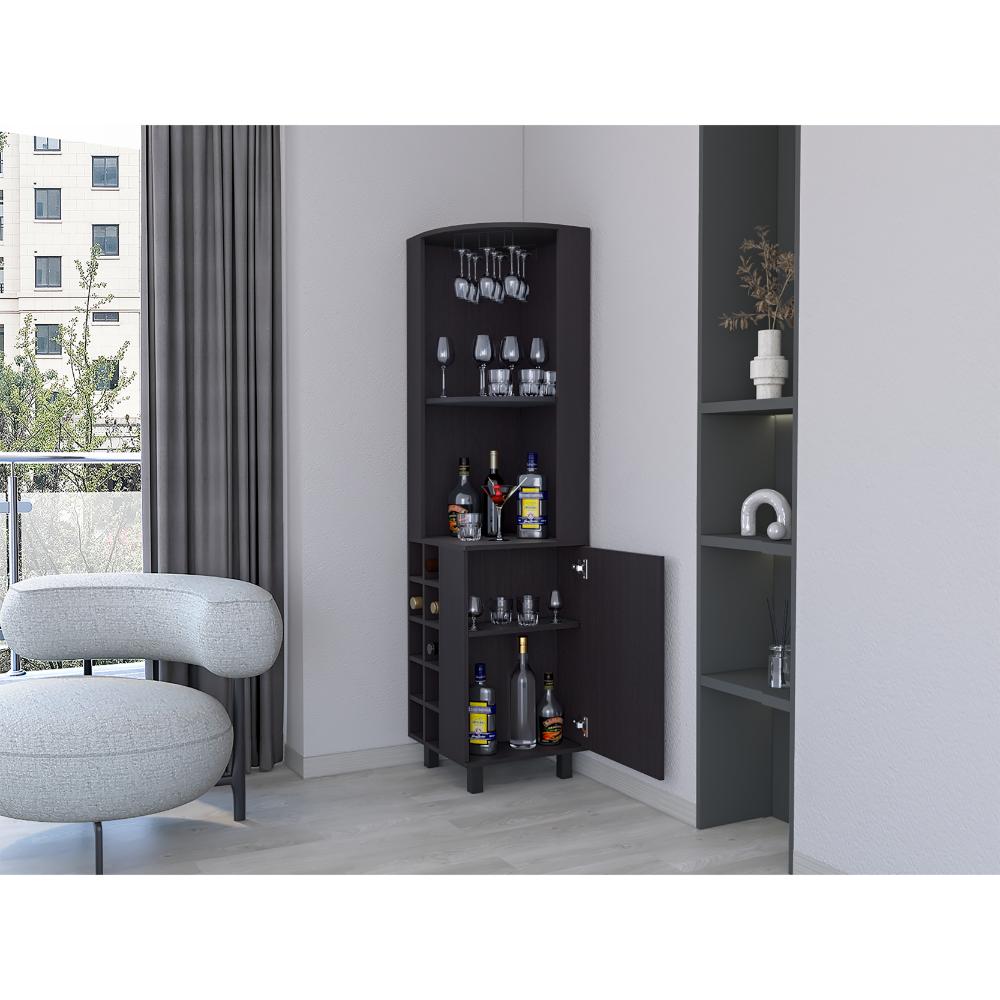 Bar Esquinero, con espacio superior para almacenar copas de vino, espacio para organizar licores, patas metálicas en acero negro