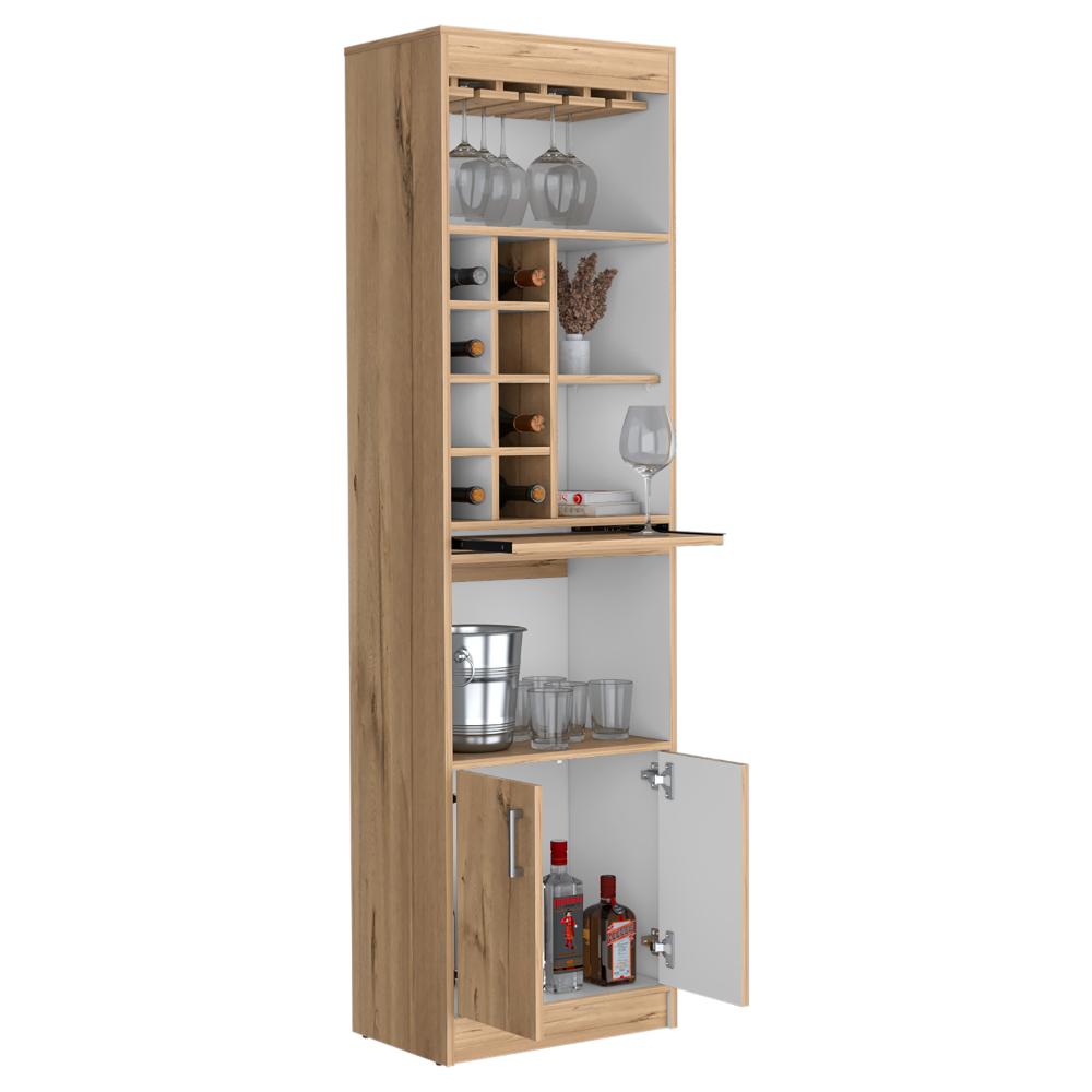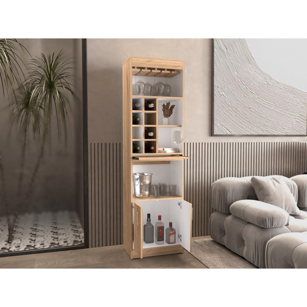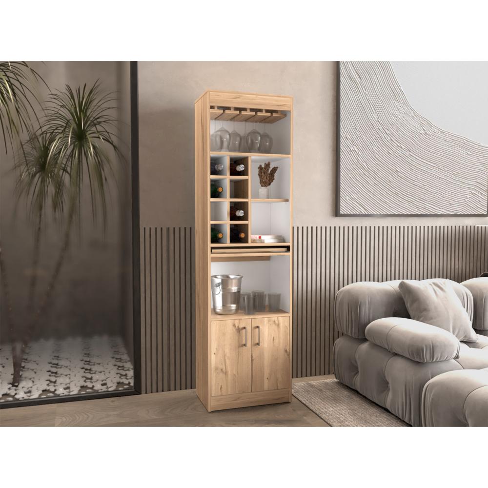 Bar, con espacio superior para colocar copas de vino, espacio central para organizar botellas de vino u otros licores, mesa central deslizable con rieles metálicos, dos puertas inferiores abatibles, manijas metálicas.