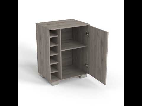 Bar, con 1 puerta, variedad de entrepaños, espacio para botellas y portacopas.
