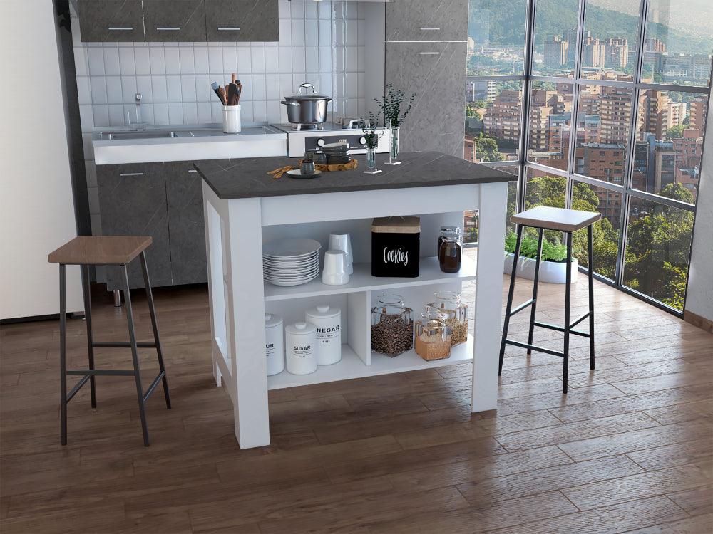 Barra de Cocina, con amplia superficie en la mesa, dos entrepaños para ubicar botellas, copas y otros elementos.