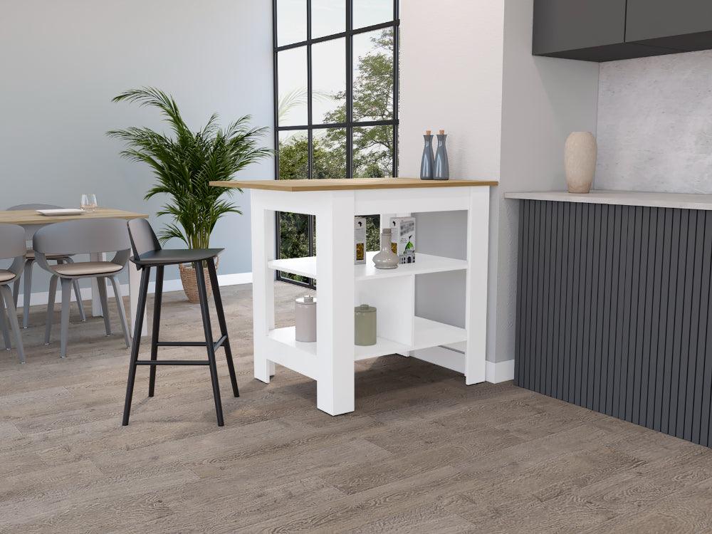 Barra de Cocina Caprim, Blanco Duqueza y Macadamia, con entrepaños para ubicar objetos