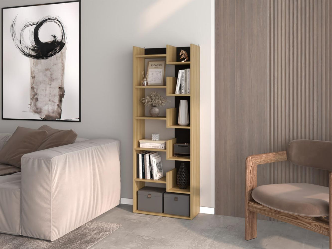 Biblioteca, con múltiples entrepaños y espacios para guardar y poner objetos.