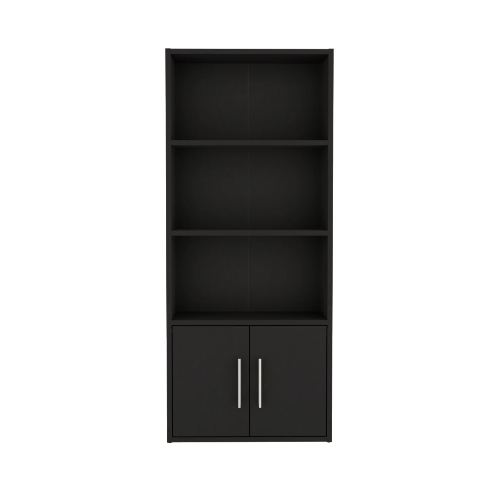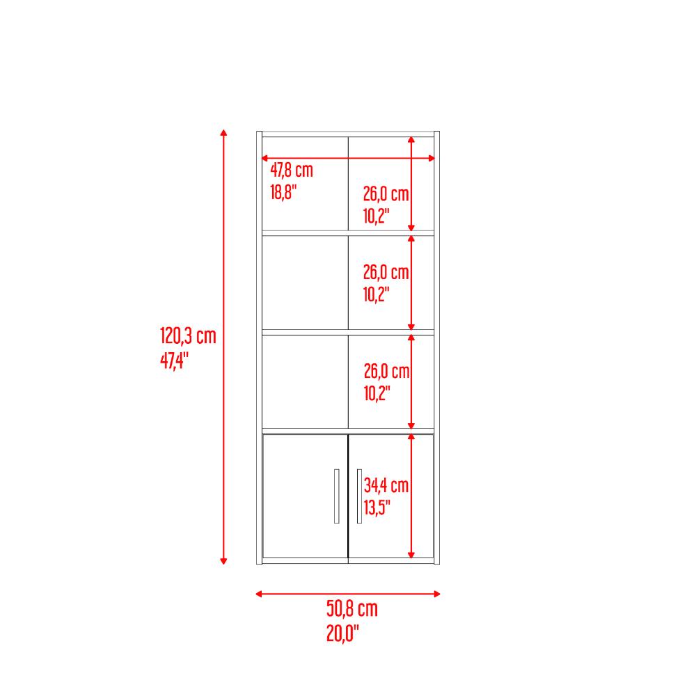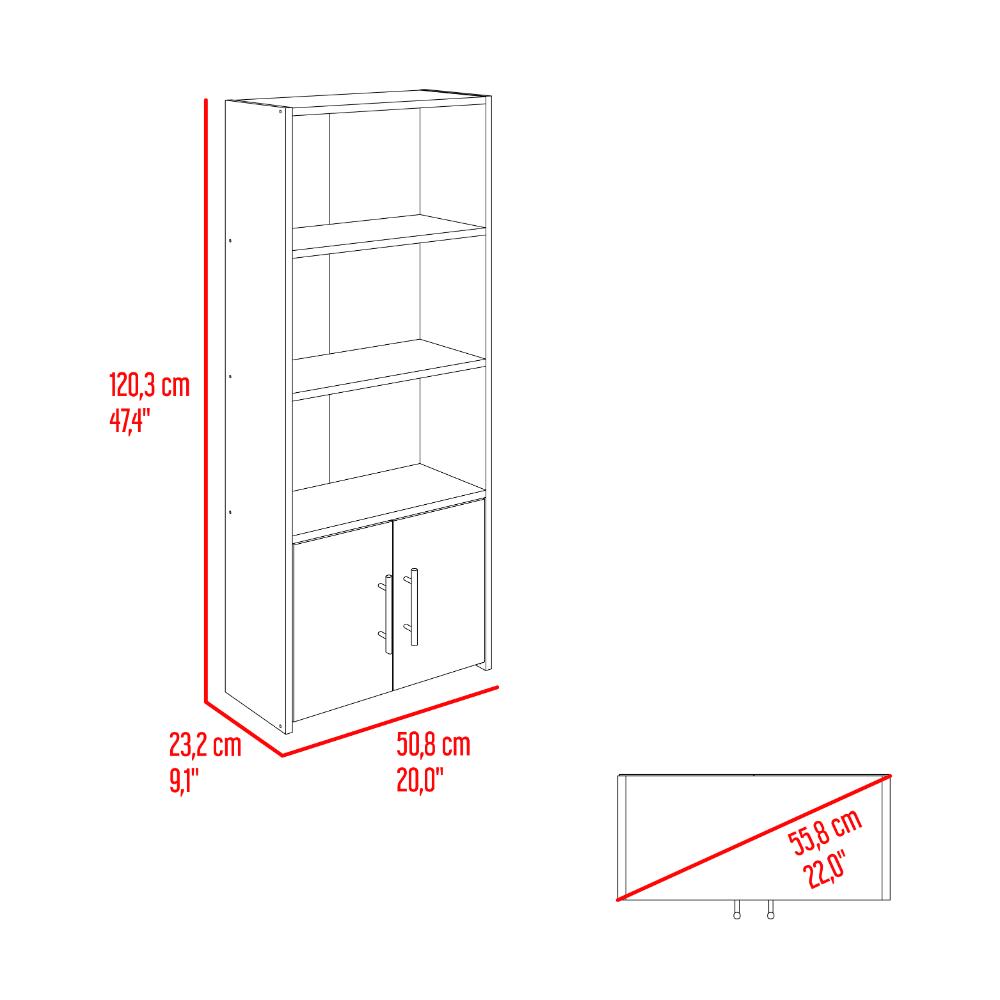 Biblioteca, con dos puertas abatibles, manijas metalicas, amplios espacios para ubicar libros, objetos decorativos y es de facil instalación