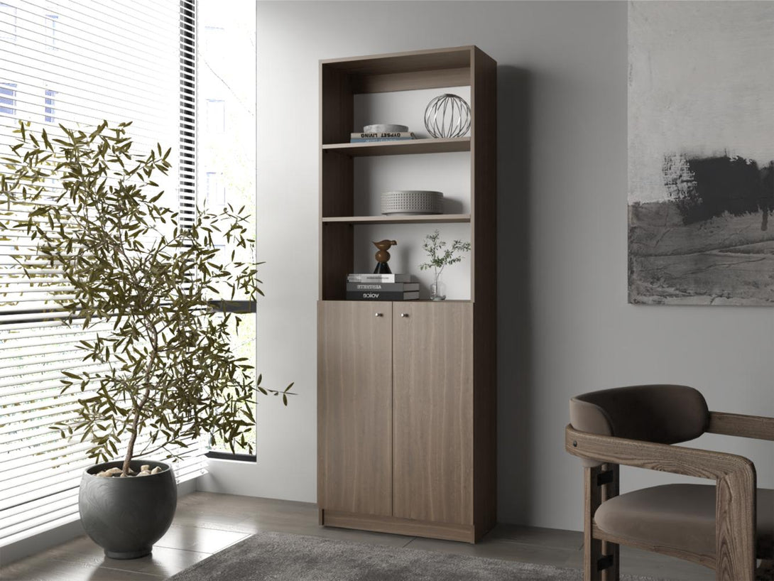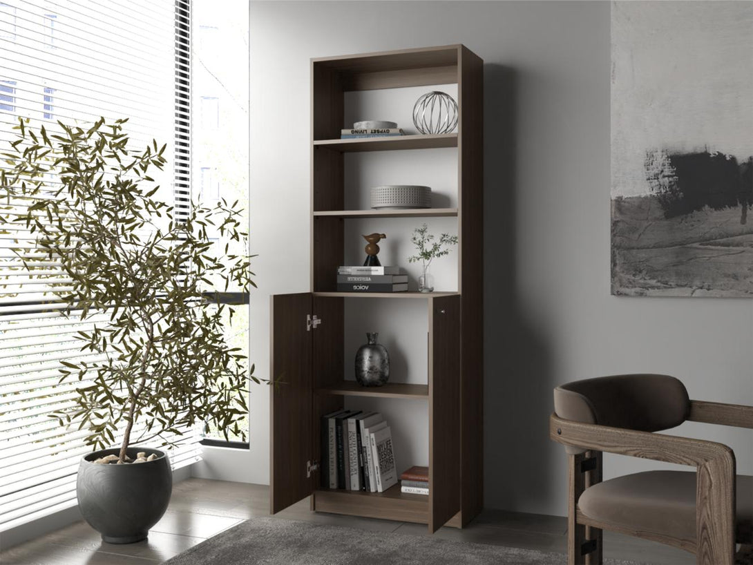 Biblioteca, con cinco entrepaños para ubicar libros y elementos decorativos y dos puertas abatibles.