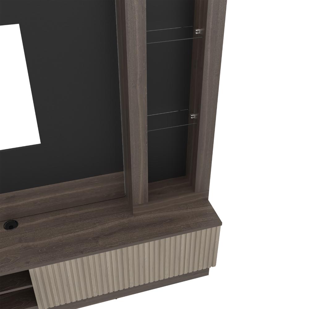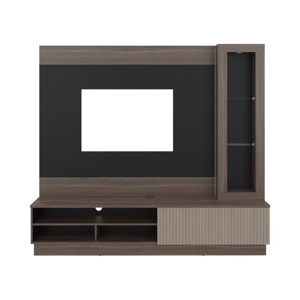 Centro de Entretenimiento para TV de hasta 65'' con sistema de iluminación, compartimentos para objetos decorativos, una puerta batiente, combinación de colores, entrepaño de vidrio.