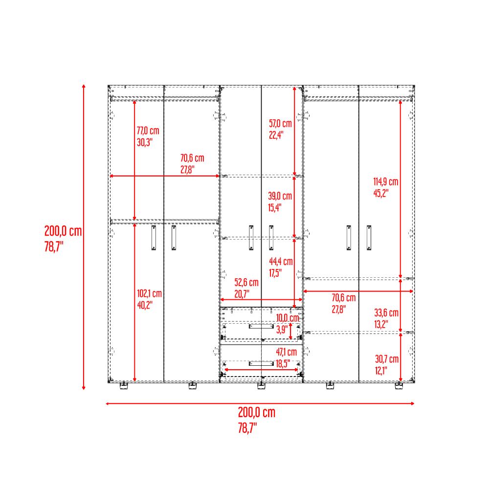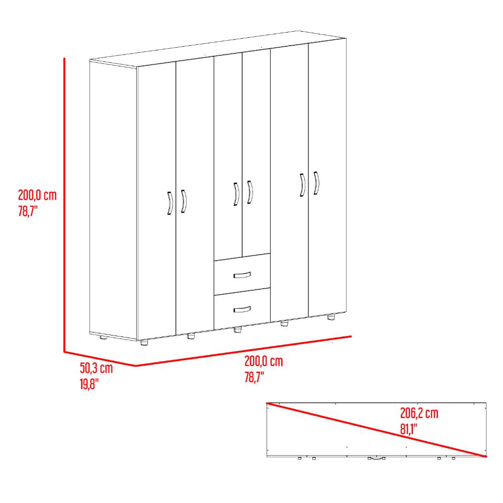 Closet, con cuatro puertas abatibles, dos cajones, tres tubos de acero cromado para colgar ropa, amplios espacios para guardar ropa.