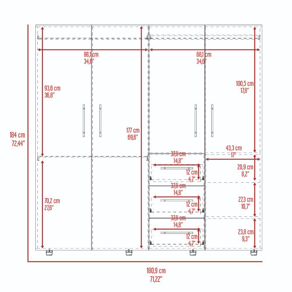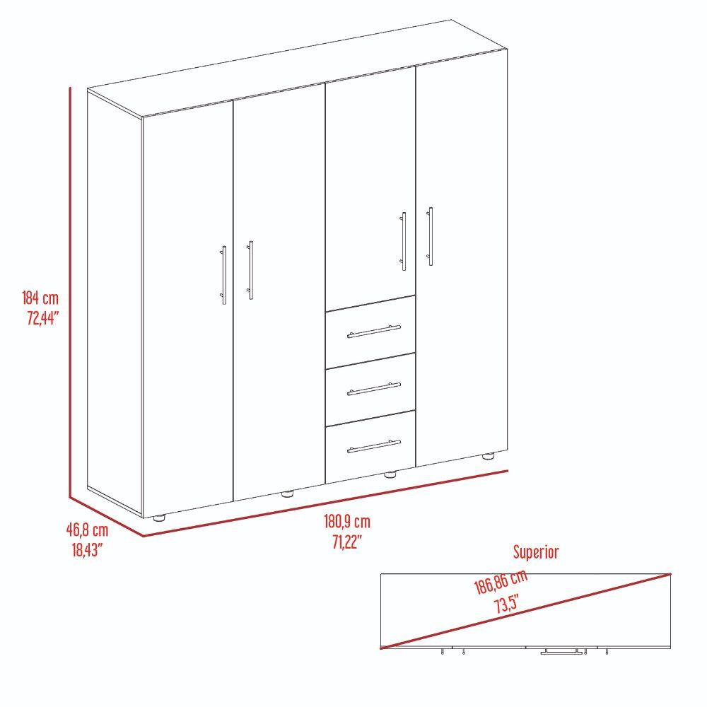 Closet, con 3 tubo cromados, 3 entrepaños, 3 cajones y 4 puertas batientes.