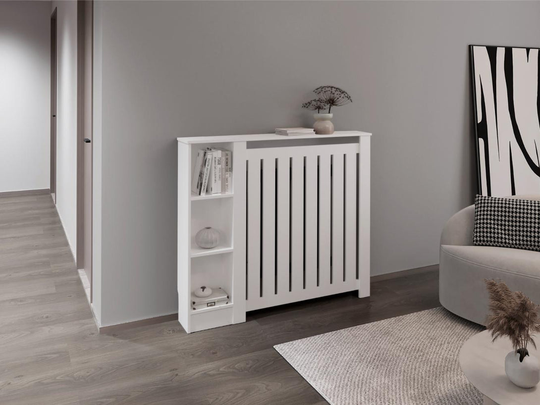 Cubierta para Radiador, con listones que permite la circulación del calor, cuenta con espacio para colocar objetos decorarivos y es de facil armado