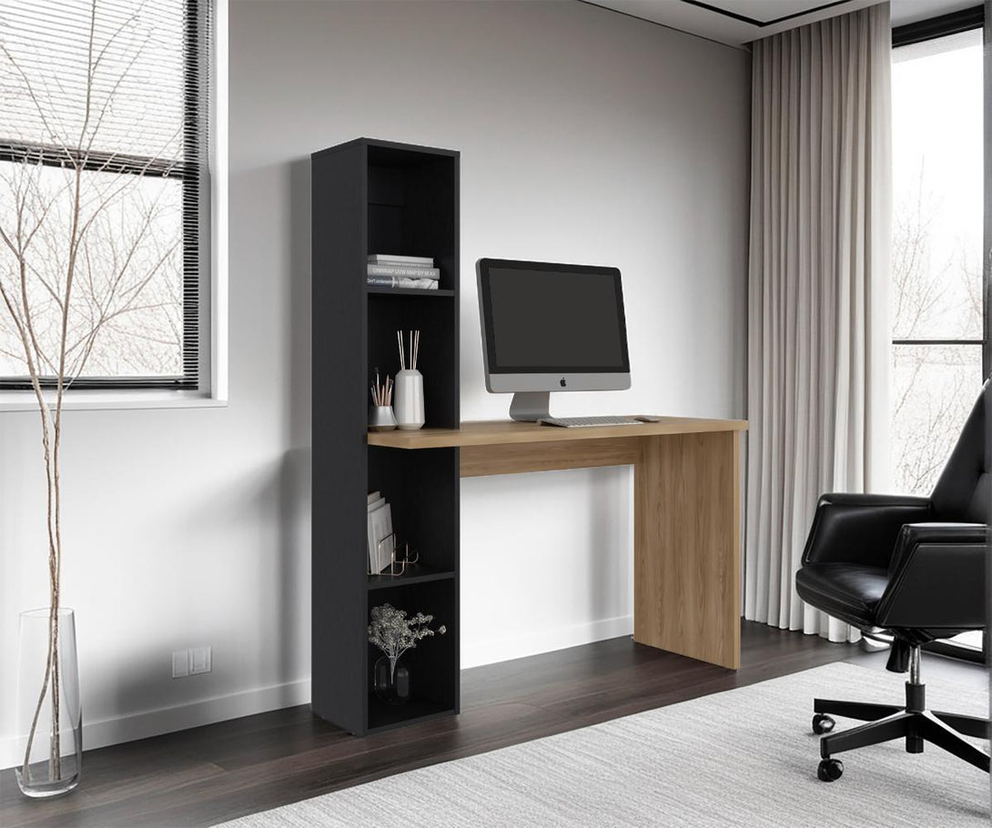 Escritorio, con cespacio para guardar objetos como libros o decorativos, combinación de colores, y es facil de instalar.