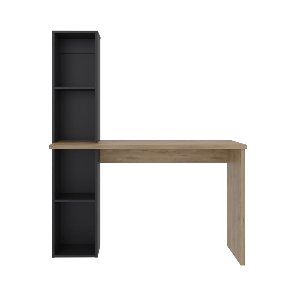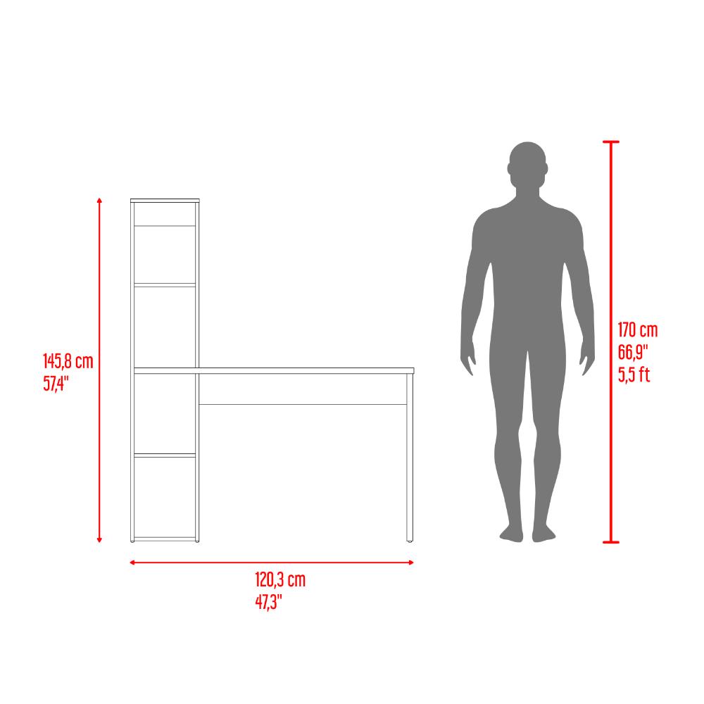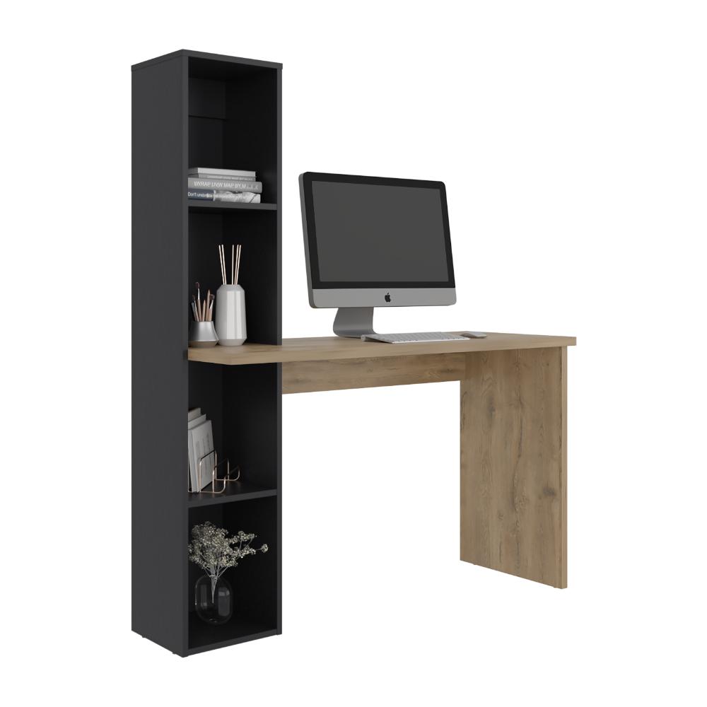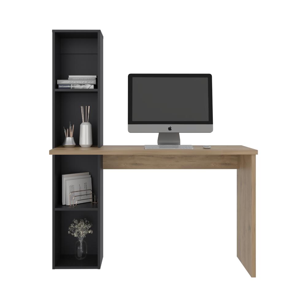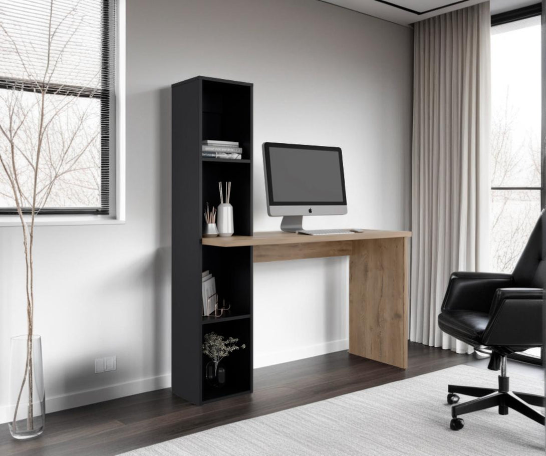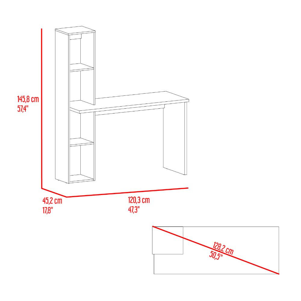 Escritorio, con cespacio para guardar objetos como libros o decorativos, combinación de colores, y es facil de instalar.