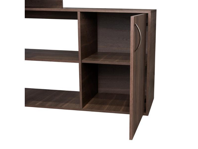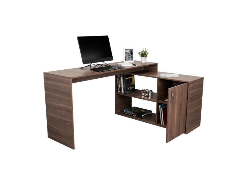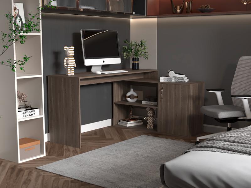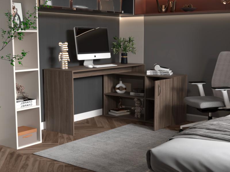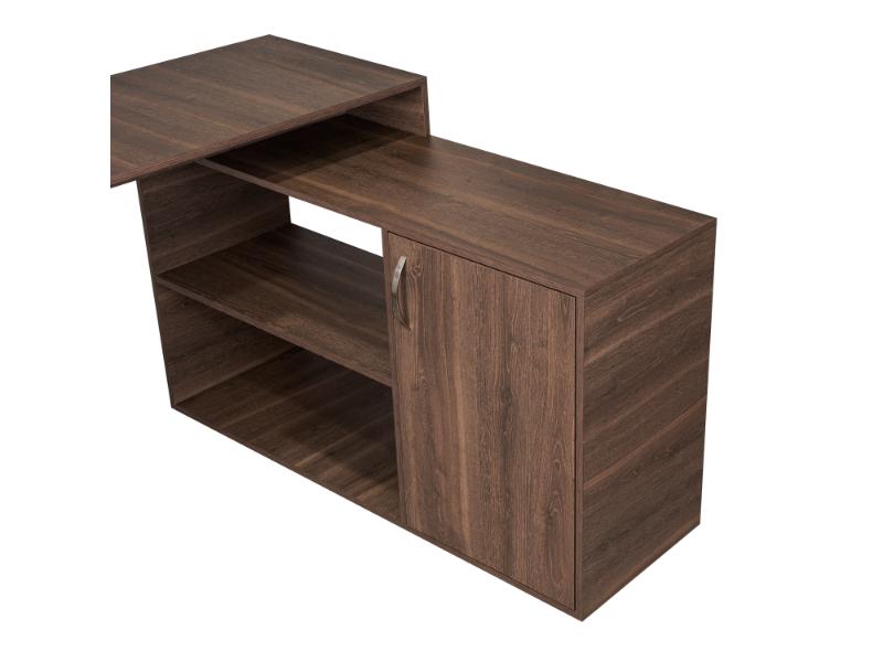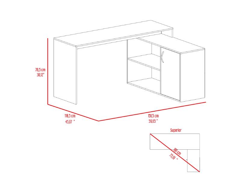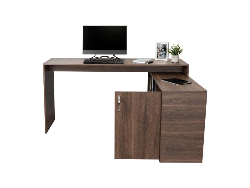 Escritorio en L, con espacio, puerta batiente para almacenar libro u otro, y