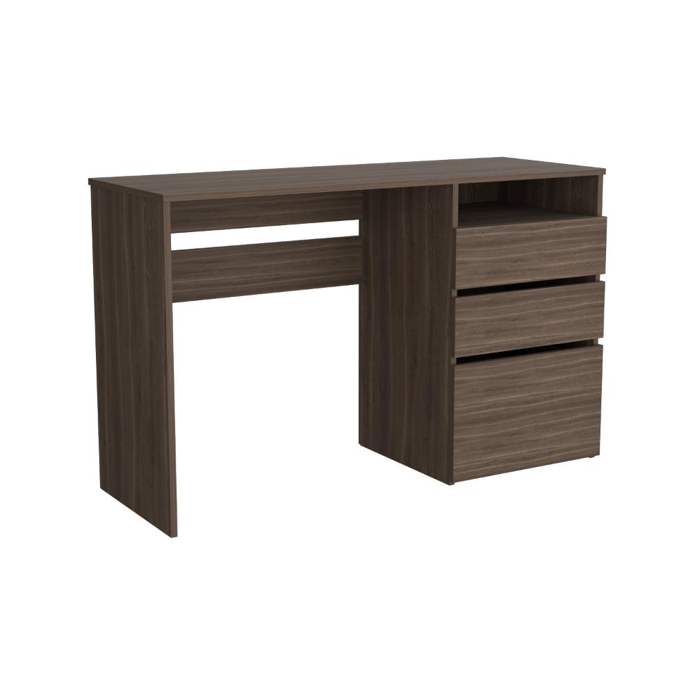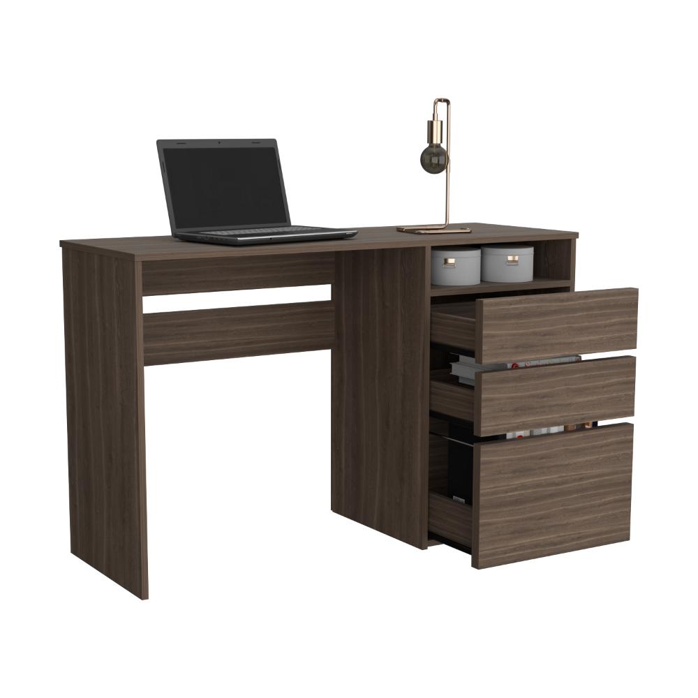 Escritorio, con 1 cajón archivador con corredera metálica deslizable, 2 cajones multiusos con correderas metálicas, y espacio para ubicar objetos.