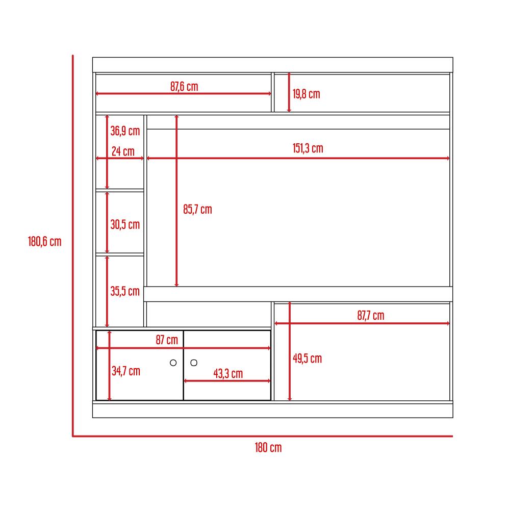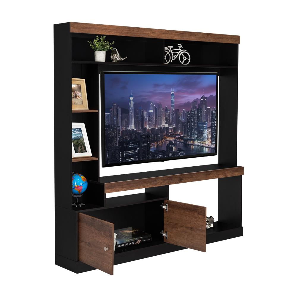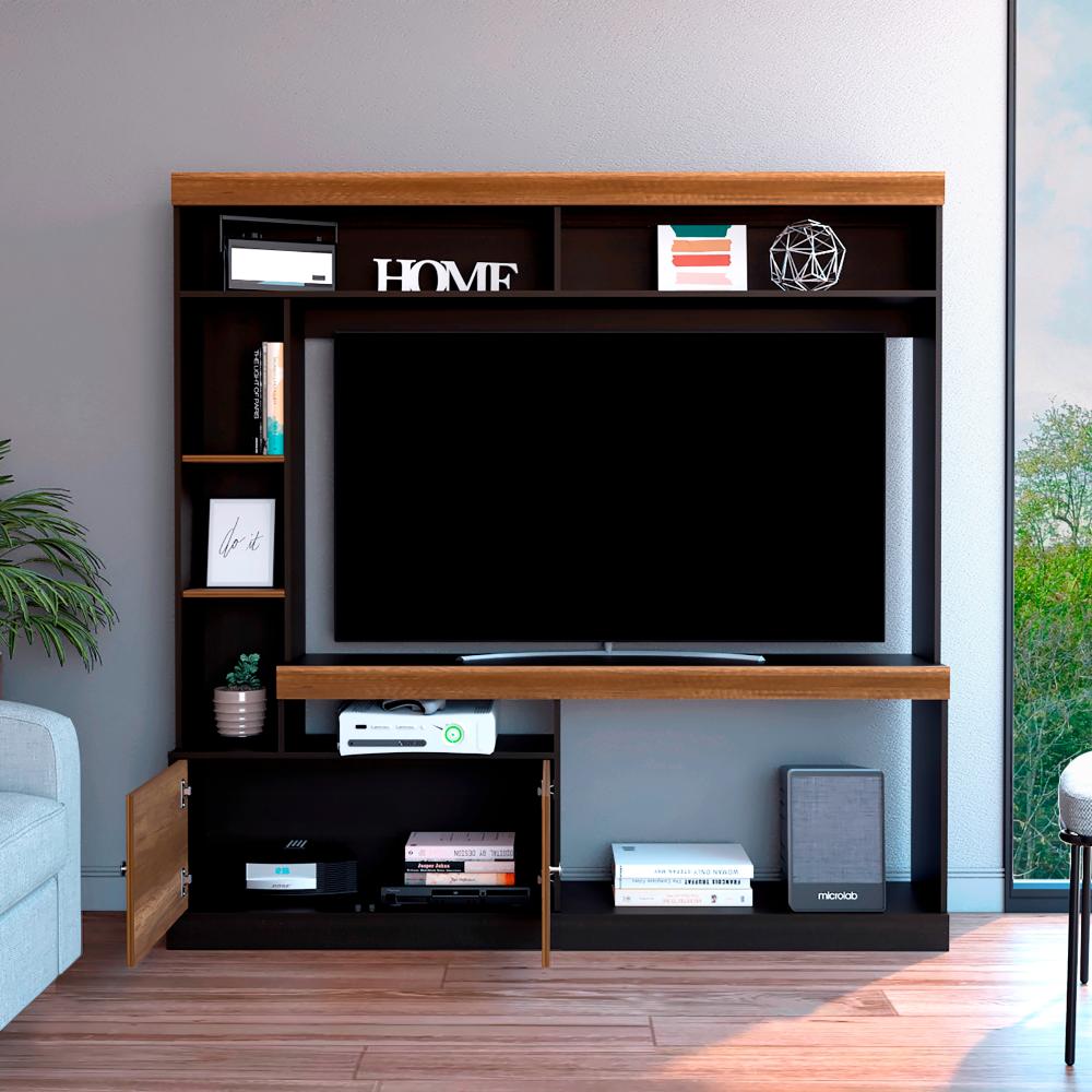 Mesa para TV, con capacidad para televisor de 55”, 2 puertas batientes, y varios entrepaños para ubicar objetos.