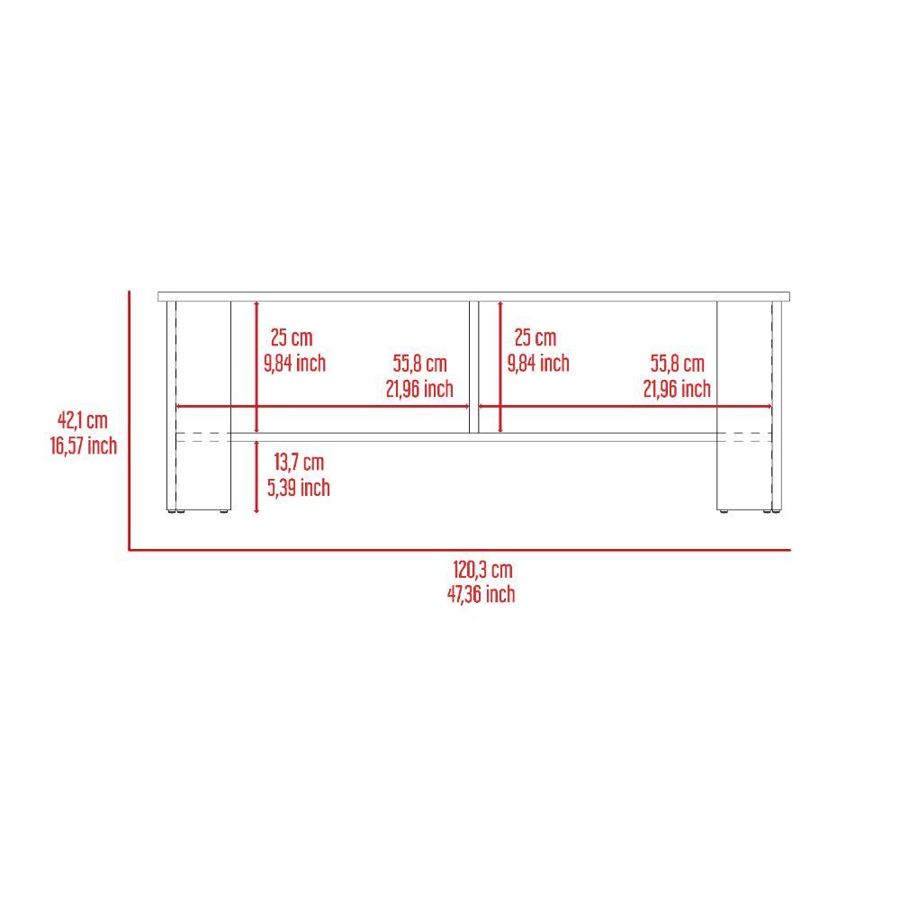 Mesa para TV de 65". cuenta con un entrepaño y dos compartimentos para almacenar objetos.