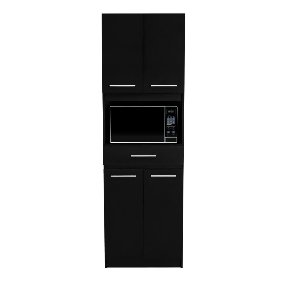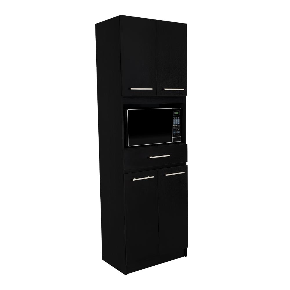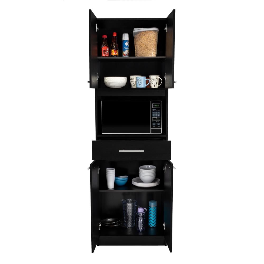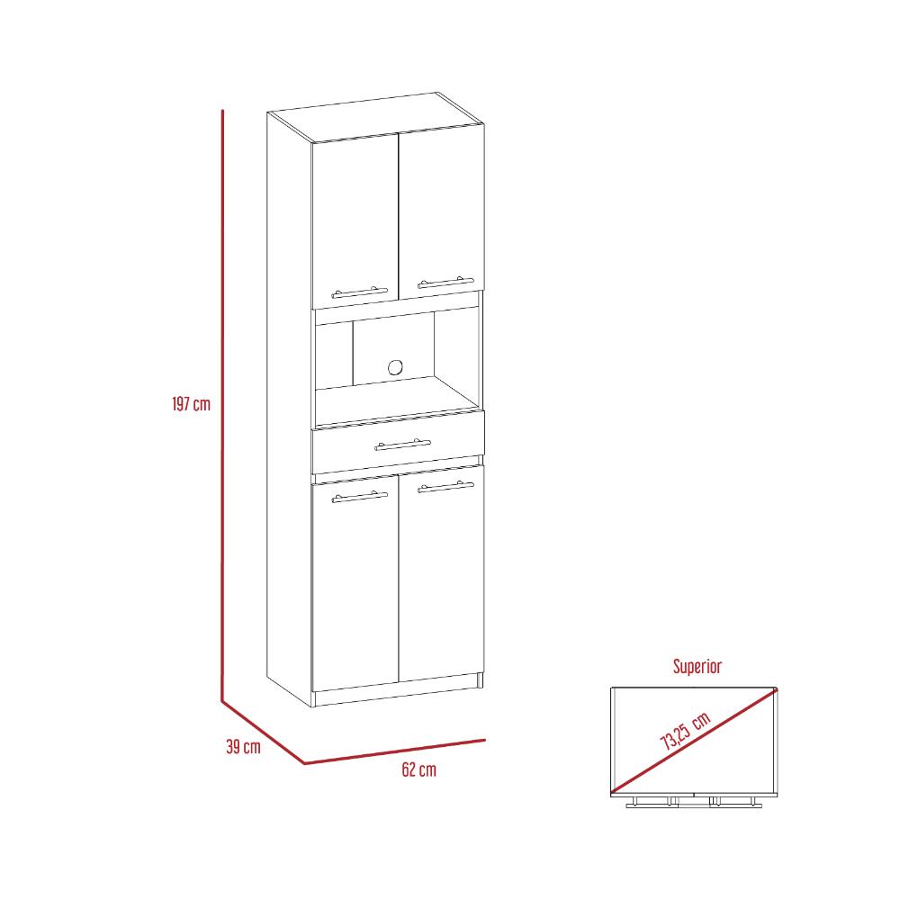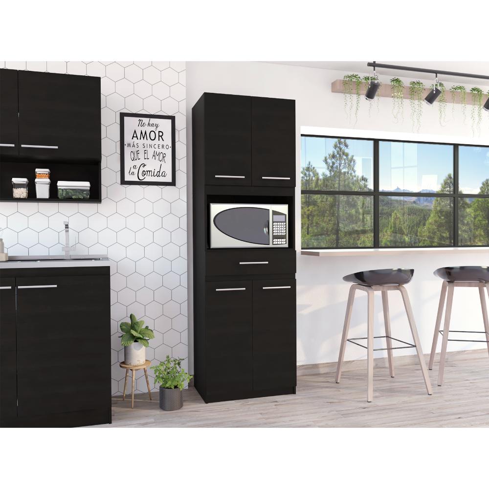 Módulo Microondas, con espacio para horno microondas, 4 puertas abatibles, compartimientos superiores e inferiores para guardar alimentos, utensilios de cocina y/u otros, manijas metálicas, 1 cajón central multi-uso correderas deslizables.