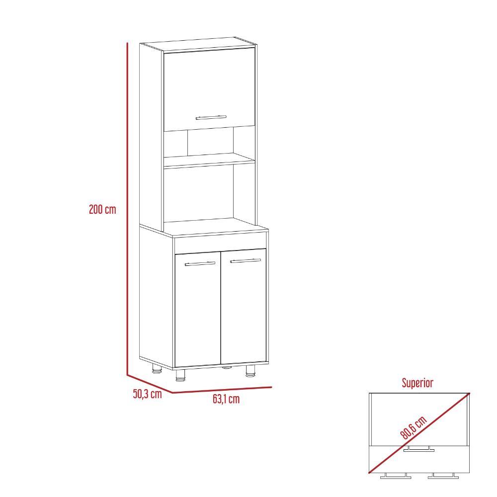 Módulo Microondas, con tres puertas abatibles, espacio para horno microondas, amplio espacio para almacenar, patas metálicas.