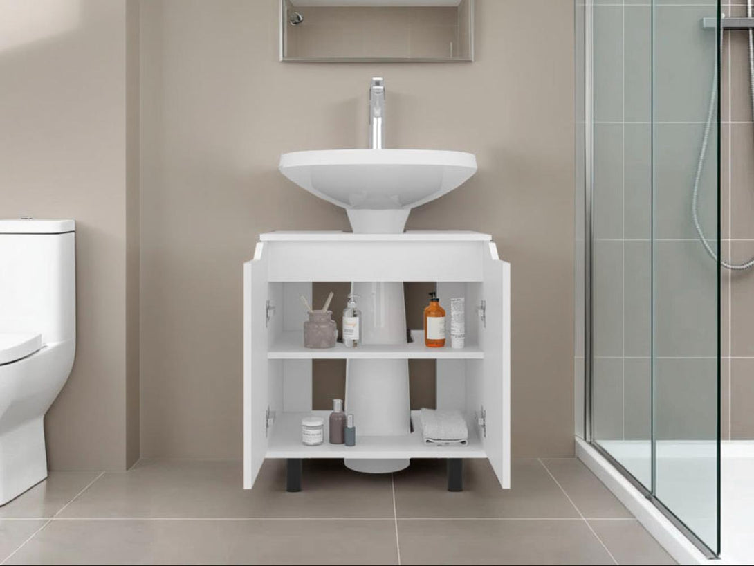 Mueble Lavamanos, con espacio para colocar objetos, una puerta abatible, una patas metalica y es de facil instalación