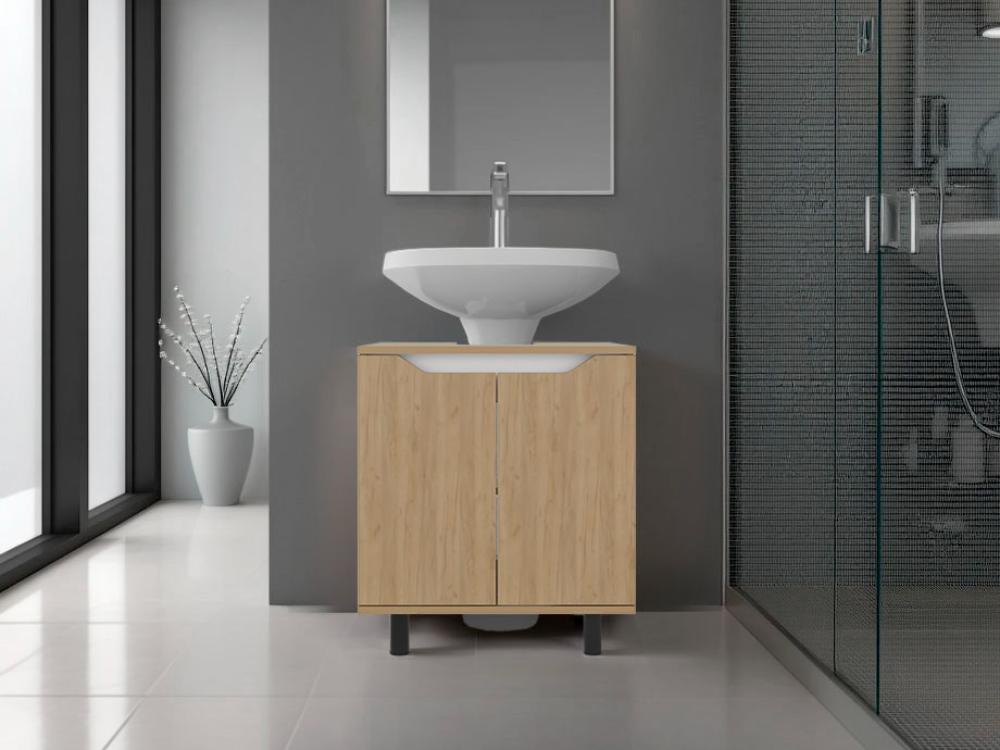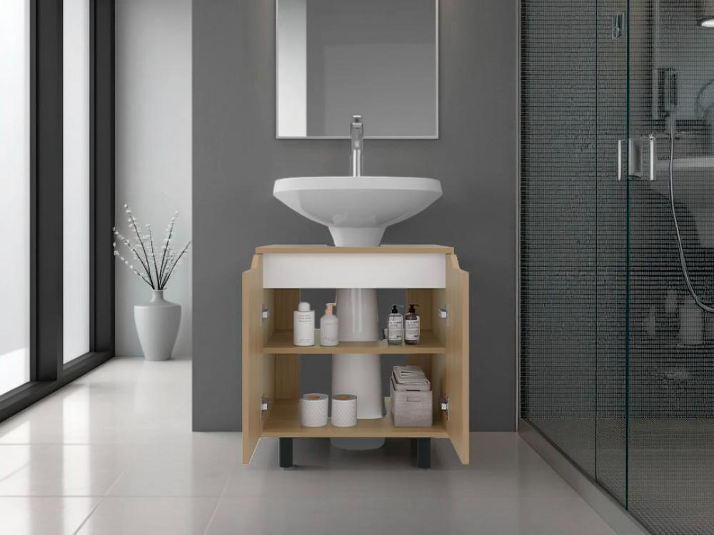 Mueble Lavamanos, con espacio para colocar objetos, una puerta abatible, una patas metalica y es de facil instalación