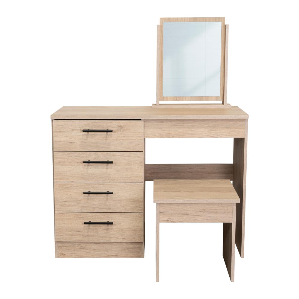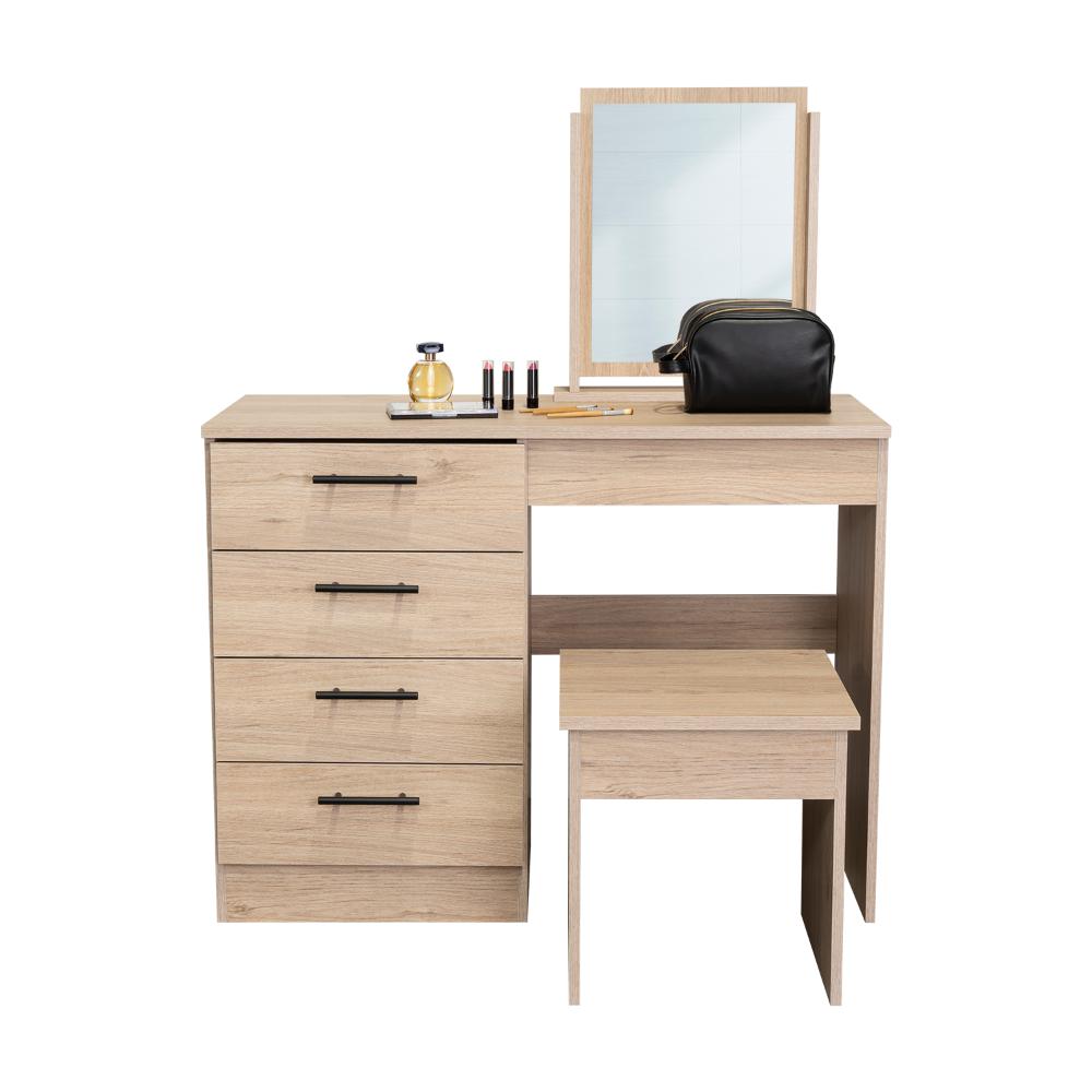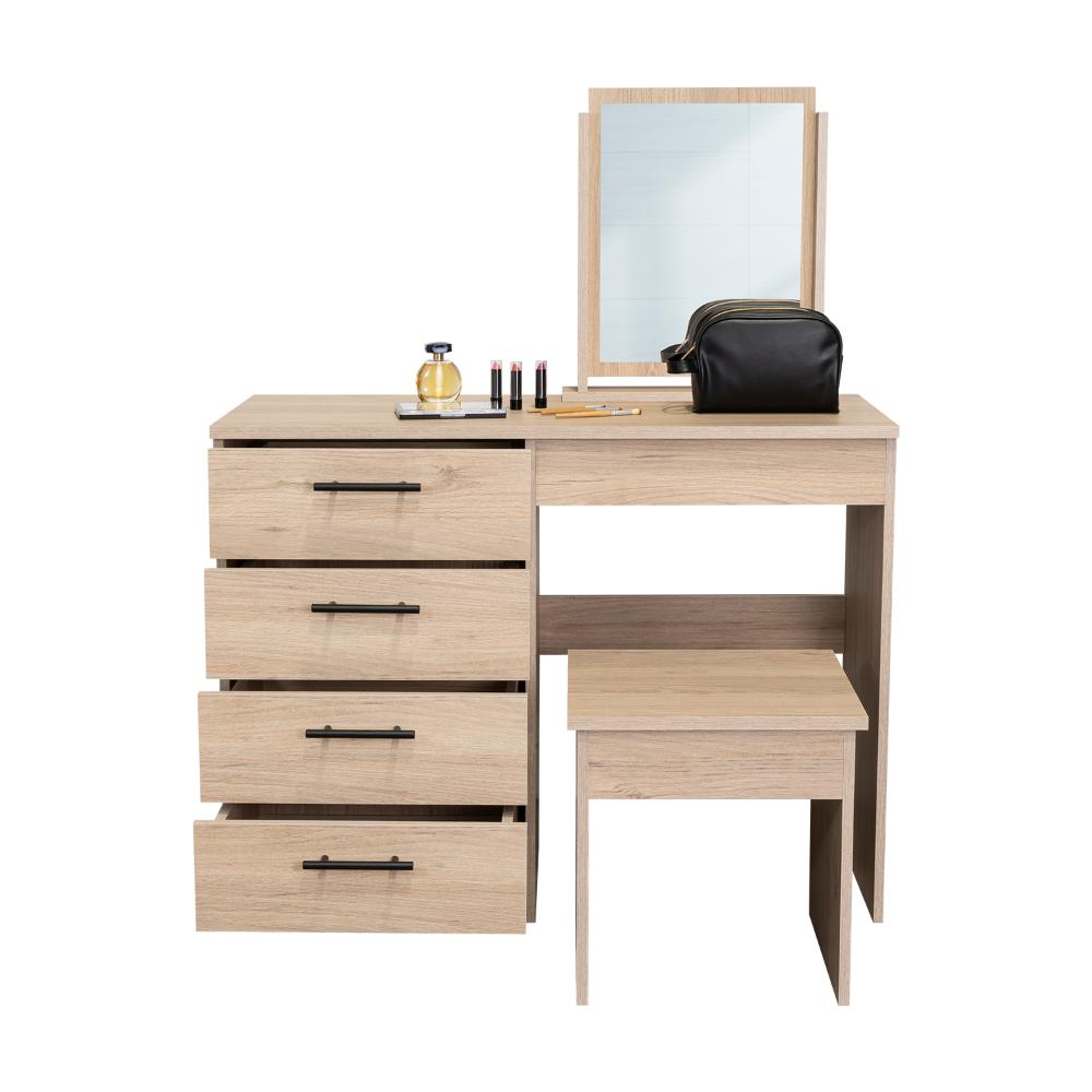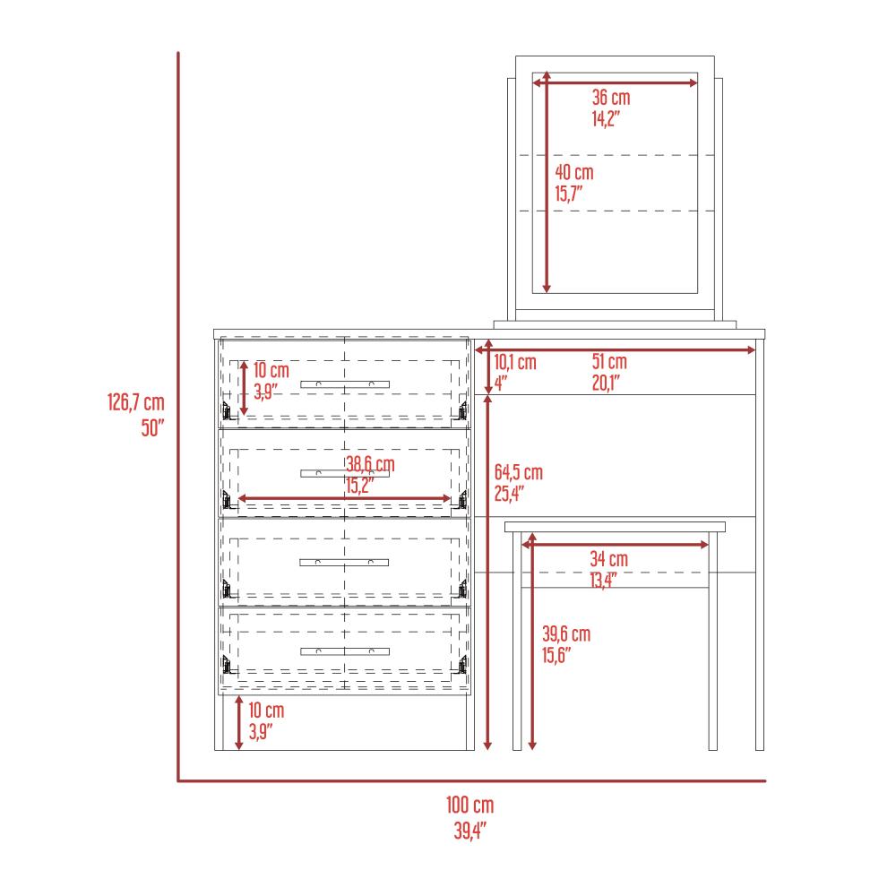 Tocador, con diseño moderno, espacio para ubicar maquillaje, un espejo, tres cajones, una banca.
