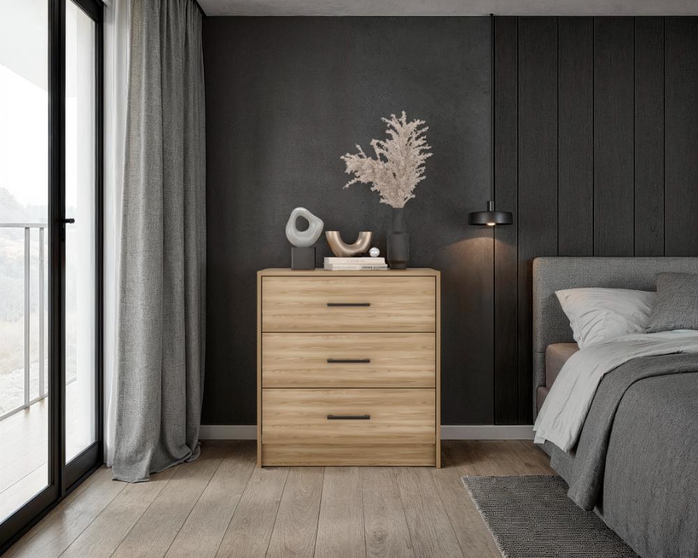 Organizador, con tres amplios cajones deslizables para guardar objetos personales, espacio superior para objetos decorativos y diseño moderno.
