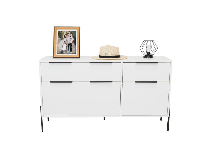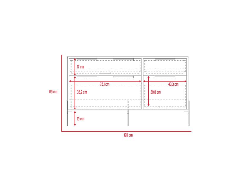 Organizador, con cuatro cajones para guardar y organizar, superficie para elementos decorativos, patas metálicas
