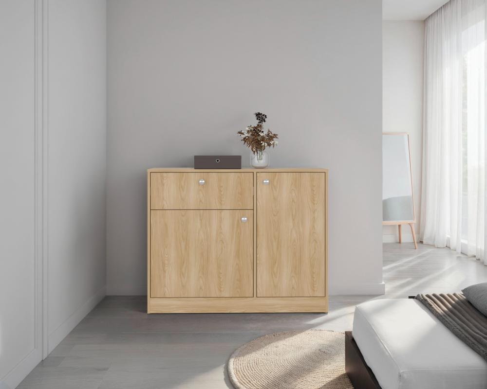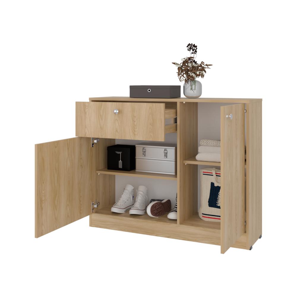 Organizador, cuanta con 2 puertas abatibles, 1 cajon multiusos, 2 entrepaños divisores, deslizadores en U para una facil movilidad, espacio para ubicar objetos, y es de facil instalatación.