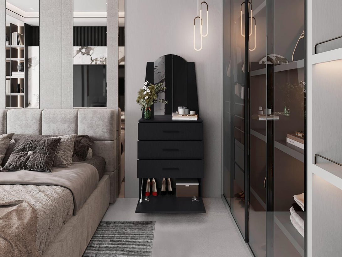 Organizador, cuenta con 3 cajones y 1 puerta, manija metalica, incluye espejo y es de facil instalación.