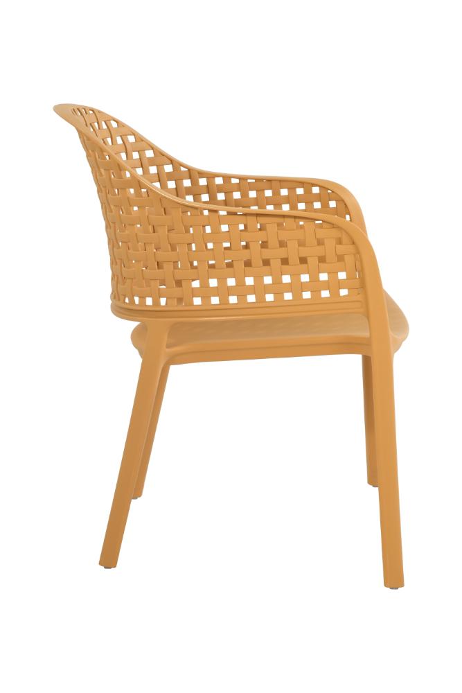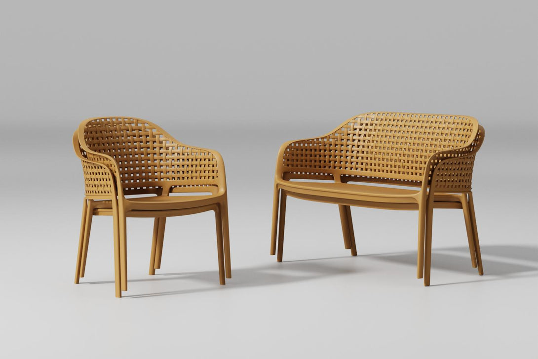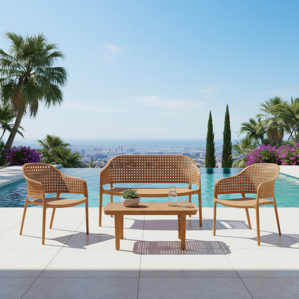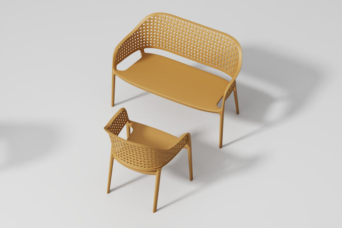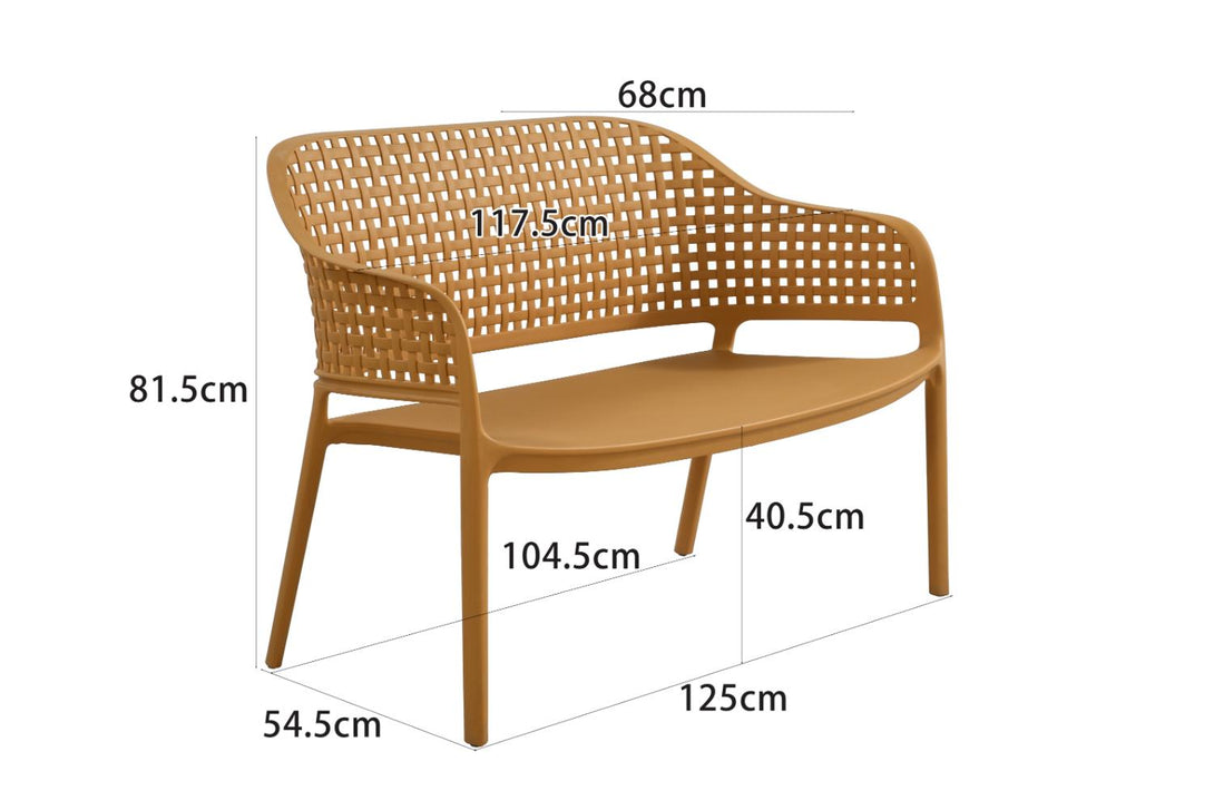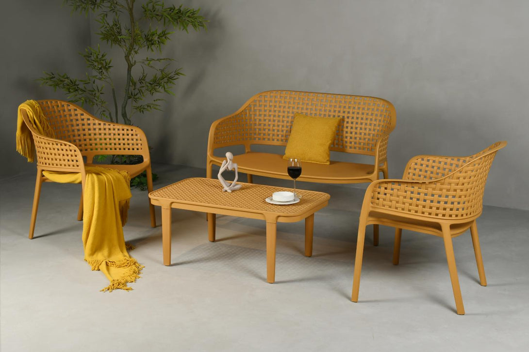 Elaborado en Polipropileno y protección a los rayos UV el set incluye mesa centro, dos sillas y un banco, en Color Naraja
