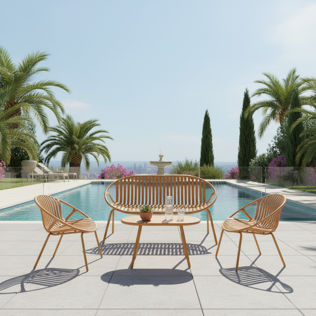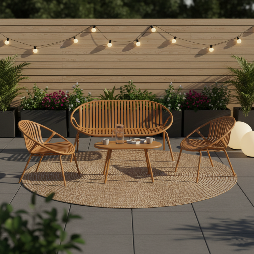 Elaborado en Polipropileno y protección a los rayos UV el set incluye mesa centro, dos sillas y un banco en patas metalicas, en Color Naranja