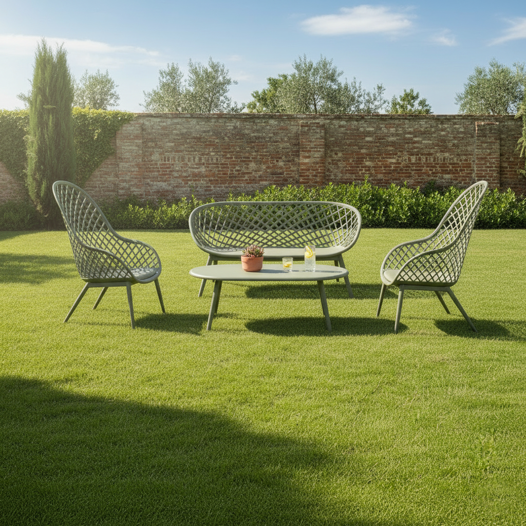 Elaborado en Polipropileno y protección a los rayos UV el set incluye mesa centro, dos sillas y un banco, en Color Verde Olivo